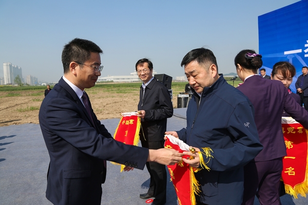 圖為區(qū)領(lǐng)導(dǎo)向東方集團(tuán)董事長(zhǎng)張振國授予全區(qū)分檔奪旗競(jìng)賽第一名的紅旗